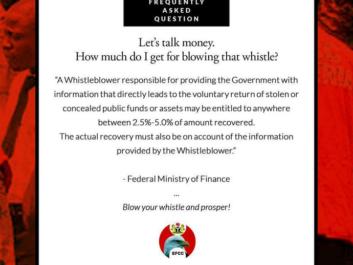 The Economic and Financial Crimes Commission, EFCC, has urged Nigerians to engage in whistle blowing. The commission made the appeal in a...