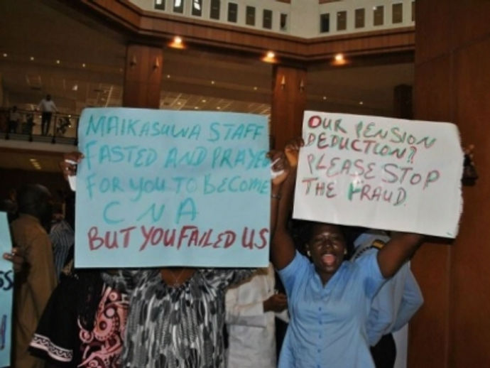 Inscriptions on the placards displayed by the aggrieved workers which conveyed their anger say “Stop deduction of pension from our...